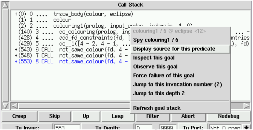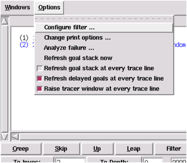 With TkECLiPSe, we can do more than just place a spy point on a predicate: we can specify further conditions for when the tracer should stop at a spy point, using the filter tool.