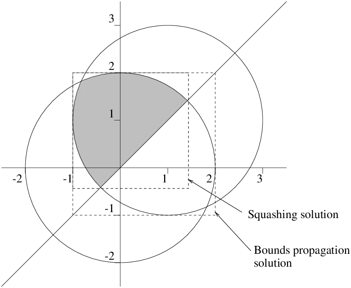 Squash works by deterministically cutting off parts of the domains of variables which it determines cannot contain any solutions. In effect, it is like a stronger version of bounds propagation. Consider the problem of finding the intersection of two circular discs and a hyperplane (see Figure 9.5). Again, normal propagation does not deduce more than the obvious bounds on the variables: