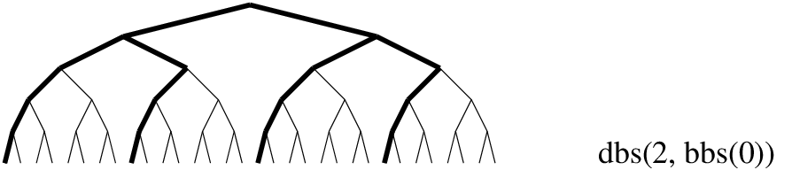 Only the first 4 solutions are found, the next solution would have required more backtracks than were allowed. Note that the solutions that are found are all located on the left hand side of the search tree. This often makes sense because with a good search heuristic, the solutions tend to be towards the left hand side. Figure 12.9 illustrates the effect of bbs (note that the diagram does not correspond to the queens example, it shows an unconstrained search tree with 5 binary variables).