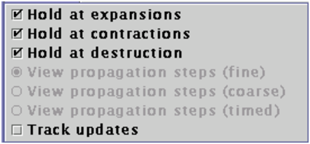 Figure 3.7 shows the default settings for the Options menu. Note that the View propagation steps options are disabled because ECLiPSe has control and the update granularity can only be changed when the Java VC is holding control.