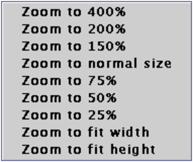 So as to facilitate visualisation of large viewables, all viewers have the ability to zoom in and out. All the options are self explanatory and will not be expanded further upon except to mention that the Zoom to fit width and Zoom to fit height options operate on the whole viewer and not just the selected viewlets.