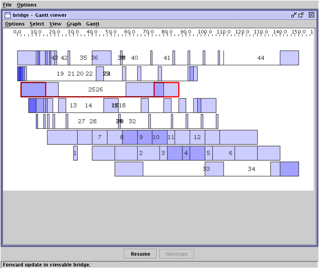 The Gantt chart viewer has many of the same options as the Network viewer previously mentioned but in addition, the Gantt menu provides access to options that control how transparent the individual gantt task bars are drawn. By selecting the transparent option, regions where tasks overlap will be rendered in a darker colour. The darker the colour, the more tasks overlap there.