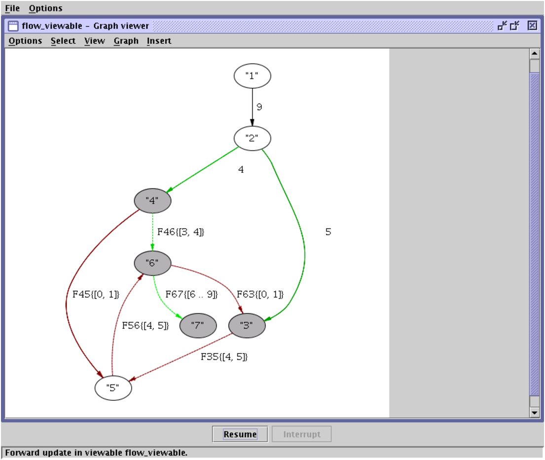 Similar to the Network viewer except that the edge labels are interpreted as fractions indicating the capacity of a link in a flow network. 0.0 indicating unused (thin black line) up to 1.0 indicating full usage (thick black line) and any number greater than one indicating over utilisation (very think red line). If the edge data cannot be interpreted as a number (eg. it is a variable) it is assumed to be 0.