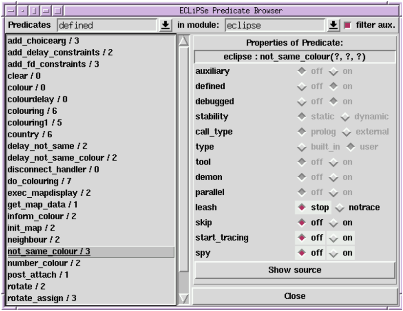 To avoid stepping through the whole program, we will add a spy-point to a predicate that may be causing the problem. Spy-points can be added in the traditional way, using the spy/1 predicate. However, we can also use the predicate browser tool: start the Predicate Browser tool from the Tools menu of TkECLiPSe. This tool allows you to observe and change various properties of the predicates in your program. A list of predicates are displayed on the left hand side, and a list of properties on the right. Currently the predicate list is showing all the predicates defined in our program (i.e. in the eclipse module). Looking at this list, not_same_colour/3’s name suggests that it checks that neighbouring countries do not have the same colour. Select it by clicking on it, and now the right hand side should display the properties of this predicate: