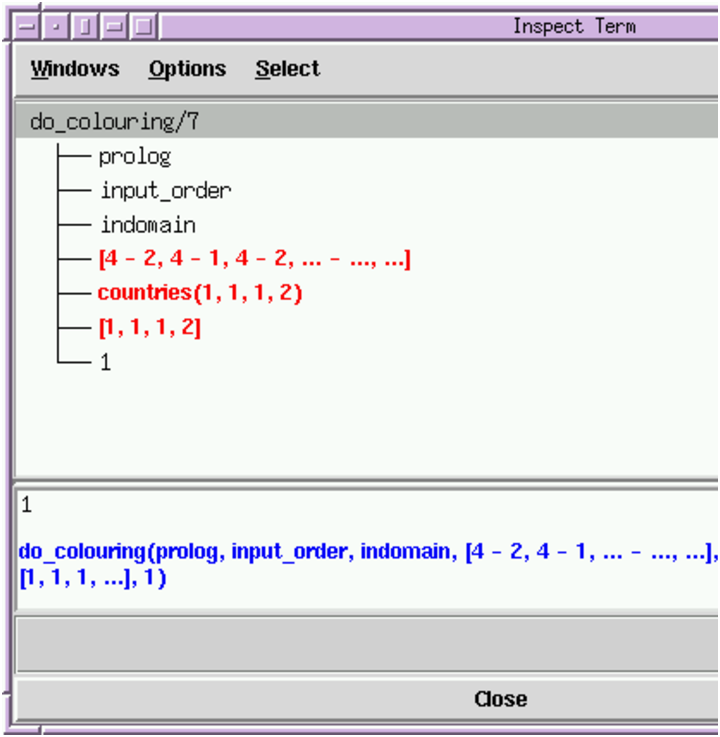 The inspector tool is modal – when it is open, the rest of TkECLiPSe is inaccessible. Close the Inspector by clicking on its Close button, go back to the tracer, and see where the country pair list comes from. It first appears in the ancestor goals do_colouring(prolog,...), as the next parent colouring(prolog,...) does not have this list. So the list is created in a body goal of colouring(...) before do_colouring(...) is called. We can look at the source of colouring(...) to see how this list is created. To do this, we can select Display source option from the popup menu for the colouring(...) goal: