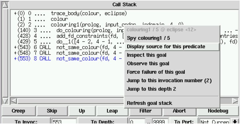 In this case, we have opened the menu over not_same_colour/3, and the options are for this goal. Various options are available, but for now we choose the Refresh goal stack option. This will result in the following goal stack display: