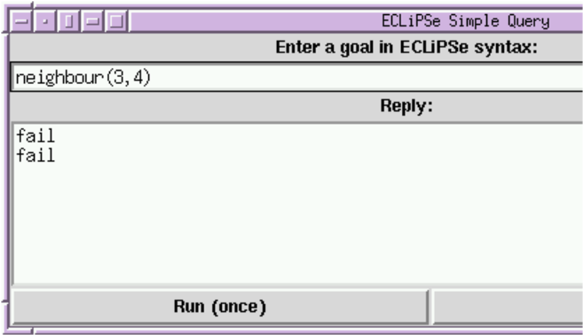 So neighbour(4,3) was indeed missing (it is commented out). Another way to check neighbour/2, without looking at the source, would be using the Simple Query tool. This tool is again started from TkECLiPSe’s Tools menu. It can be used to send simple queries to ECLiPSe, even while another query is being executed (as we are here, executing the colour query). We can use this tool to check if neighbour(4,3) or neighbour(3,4) are defined or not: