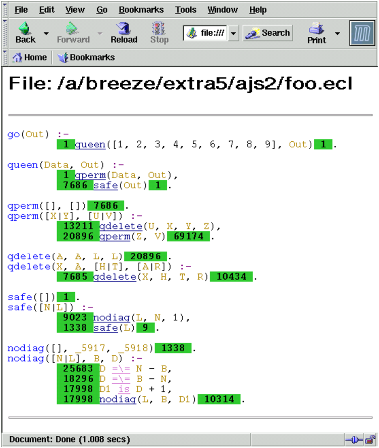 This will create the result file coverage/queens.html which can be viewed using any browser. It contains a pretty-printed form of the source, annotated with the values of the code coverage counters as described above. An example is shown in figure 6.1.