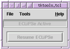 Once attached to an ECLiPSe session, the remote development tools have their own window as shown in Figure 4.3. The Tools menu is the same as in TkECLiPSe, providing access to the same suite of development tools. The main body of the window consists of one button and a status indicator. The indicator shows whether the tools can be used or not (the tools cannot be used when the ECLiPSe is active), and the button is used to pass control explicitly to ECLiPSe.