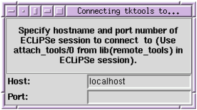 ECLiPSe prints the host and port address it expects the remote tools to attach to, and execution is now suspended waiting for the remote tools to attach. This is done by running the tktools program, which is located with the other ECLiPSe executables. As stated, this program can be run on a different machine from the ECLiPSe session, as long as the two are connected via a network such as the internet. A connection window is then displayed as shown: