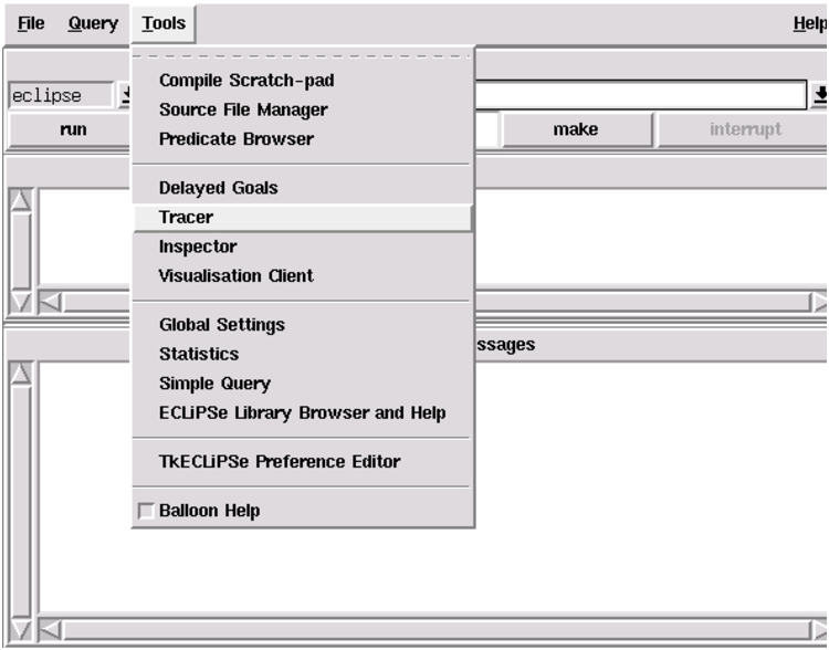 The main tool to debug a program is the tracer tool. The tracer is one of the development tools, all of which can be accessed from the Tools menu of TkECLiPSe. Select Tracer from the menu as shown below, and a new window for the tracer tool should appear.