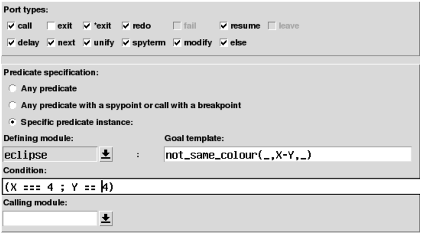 With TkECLiPSe, we can do more than just place a spy point on a predicate: we can specify further conditions for when the tracer should stop at a spy point, using the filter tool.