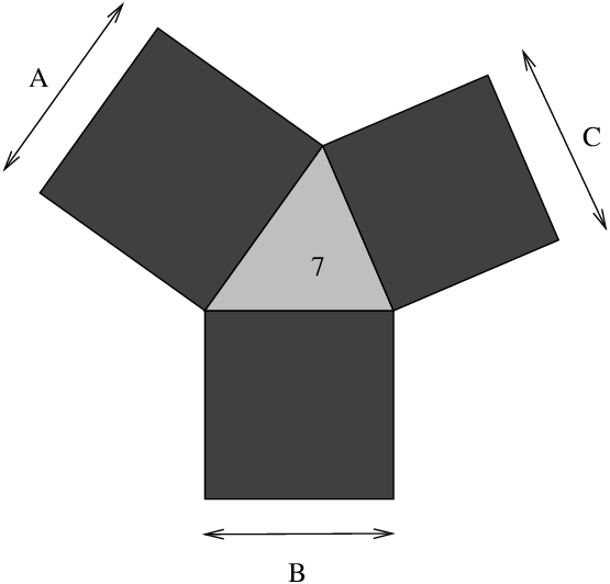 George is contemplating buying a farm which is a very strange shape, comprising a large triangular lake with a square field on each side. The area of the lake is exactly seven acres, and the area of each field is an exact whole number of acres. Given that information, what is the smallest possible total area of the three fields?