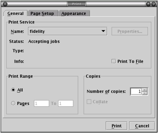 To print the current state of almost all viewers, right-click on the background and select the Print option from the popup menu. This will bring up the print dialog as shown in figure 3.16.