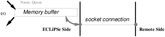 The socket stream is largely hidden from the user on the ECLiPSe side, with data automatically transferred between it and the buffer. The buffer is needed to ensure that when data is transferred between the two sides, the I/O operation is synchronised (the data is being read on one end of the socket while it is being written at the other), so no blocking will occur. When a side needs to initiate an I/O operation with the other side (either to write data to or read data from the other side via the socket stream), it must have control (otherwise it would not be in a position to initiate an action). Before performing the I/O operation, a control message is sent to the other side to allow it to prepare to read the data before the I/O operation is actually initiated. The memory queue thus serves to buffer the data before it is transferred to the socket stream.
