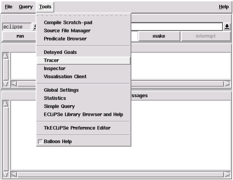 The main tool to debug a program is the tracer tool. The tracer is one of the development tools, all of which can be accessed from the Tools menu of TkECLiPSe. Select Tracer from the menu as shown below, and a new window for the tracer tool should appear.