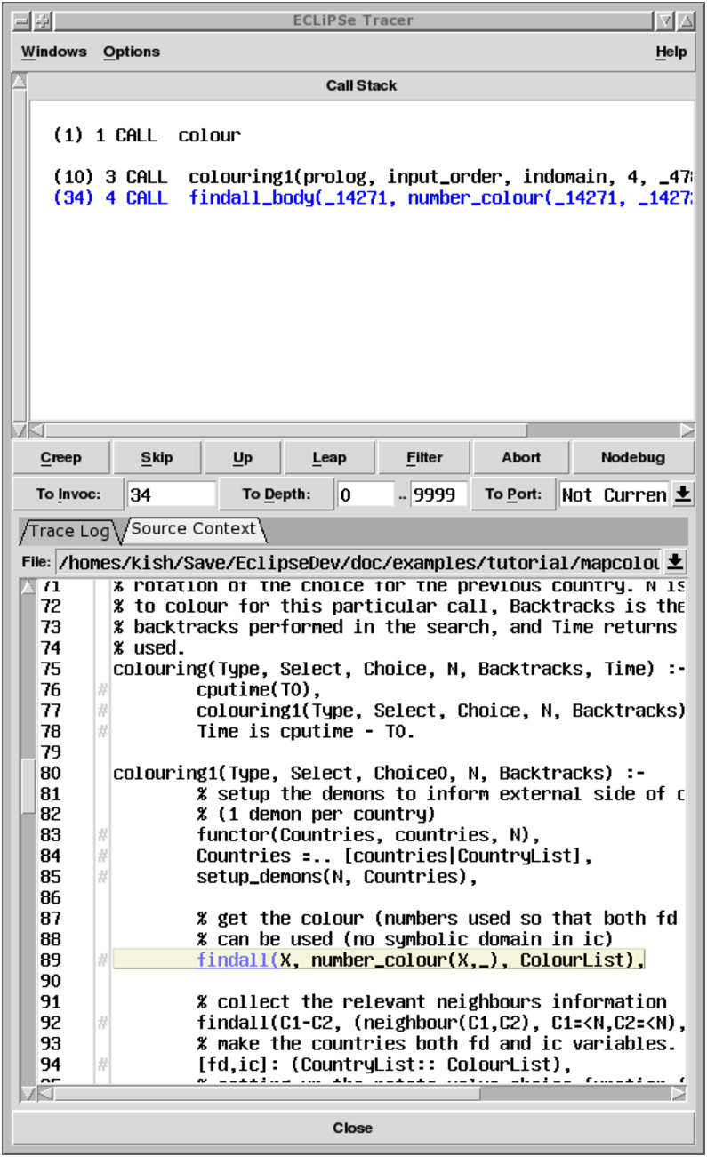With TkECLiPSe, we can do more than just place a spy point on a predicate: we can specify further conditions for when the tracer should stop at a spy point, using the filter tool.