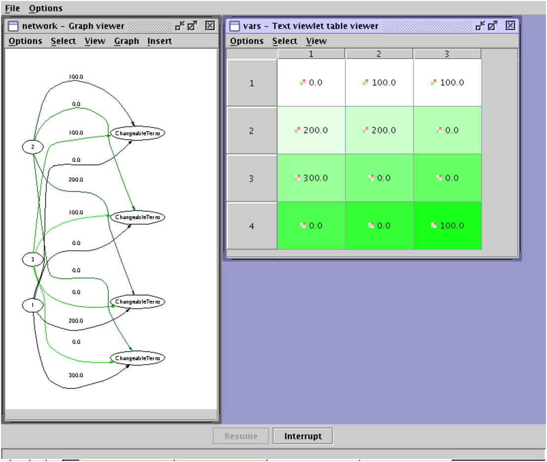 A new Java visualisation client (Java VC) can be started from the tools menu of tkECLiPSe or using the predicate start_vc/1 in lib(java_vc). The single argument will return a unique name for the created client which can be used to close the client if required. While the Java VC is running, it will react automatically to the creation of viewables during ECLiPSe execution, but it cannot visualise viewables which were created before the Java VC was running.