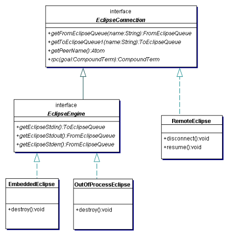 All three classes implement EclipseConnection , which provides all the functionality you would expect during a “session” with ECLiPSe. The EclipseEngine interface is implemented when the JVM “owns” the ECLiPSe engine, and so provides the methods to access the standard I/O streams. Note that the termination methods are not in either of the interfaces, but are specific to each class. Furthermore, the resume() method allows RemoteEclipse to explicitly hand control to ECLiPSe, but this operation is not supported by the other two classes.