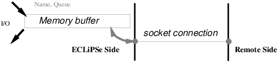 The socket stream is largely hidden from the user on the ECLiPSe side, with data automatically transferred between it and the buffer. The buffer is needed to ensure that when data is transferred between the two sides, the I/O operation is synchronised (the data is being read on one end of the socket while it is being written at the other), so no blocking will occur. When a side needs to initiate an I/O operation with the other side (either to write data to or read data from the other side via the socket stream), it must have control (otherwise it would not be in a position to initiate an action). Before performing the I/O operation, a control message is sent to the other side to allow it to prepare to read the data before the I/O operation is actually initiated. The memory queue thus serves to buffer the data before it is transferred to the socket stream.