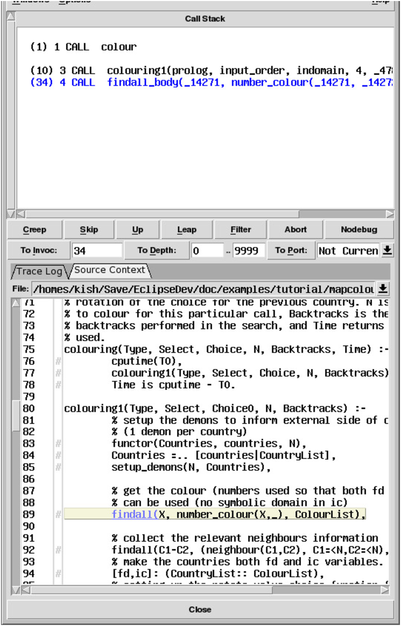 This specifies that the filter should stop at a not_same_colour/3 goal, when one of the countries in the pair X-Y is country 4: the Goal template is used to specify the template the debug port goal should match, and the Condition: can be any ECLiPSe goal, perhaps with variables from the Goal template, as in our case. The test is done by unifying the goal with the template, and then executing the condition. Note that any bindings are undone after the test.