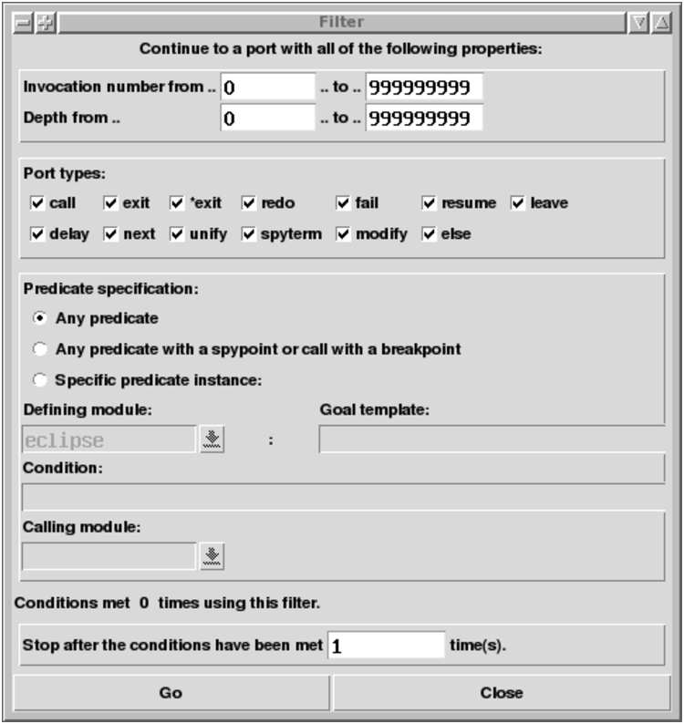 With TkECLiPSe, we can do more than just place a spy point on a predicate: we can specify further conditions for when the tracer should stop at a spy point, using the filter tool.